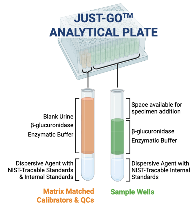 The JustGo™ workflow was developed to make routine urine drug surveillance as simple as possible. Operators simply aliquot urine samples directly into the plate, incubate to allow the β-glucuronidase to perform hydrolysis, and then place the plate in the autosampler for analysis.
