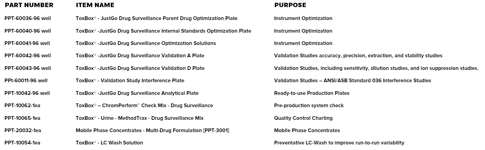 ToxBox® JustGo™ Drug Surveillance Kits deliver fast, reliable toxicology screening or confirmation in a compact, lab‑ready format—designed to support drug surveillance, emerging threat monitoring, and public health response.